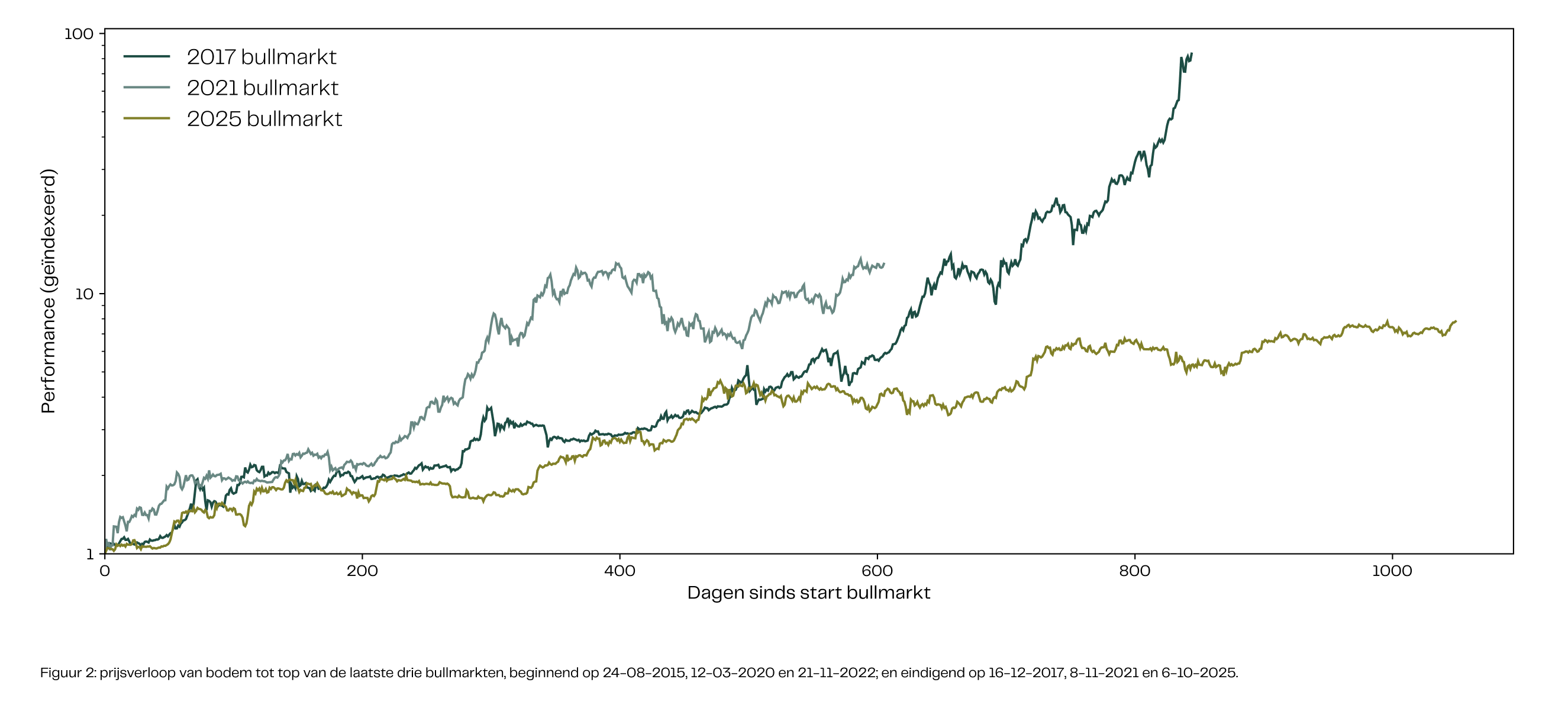 Alles wijst er dus op dat er deze cyclus geen euforie, hebzucht of FOMO (fear of missing out) heerst. Bitcoin neemt gestaag in waarde toe en roekeloze speculatie in risicovolle altcoins blijft uit. Kortom, geen herhaling van zetten, geen zoveelste cyclus, maar een opwaarts prijspatroon wat eens in de paar jaar lijkt voor te komen.